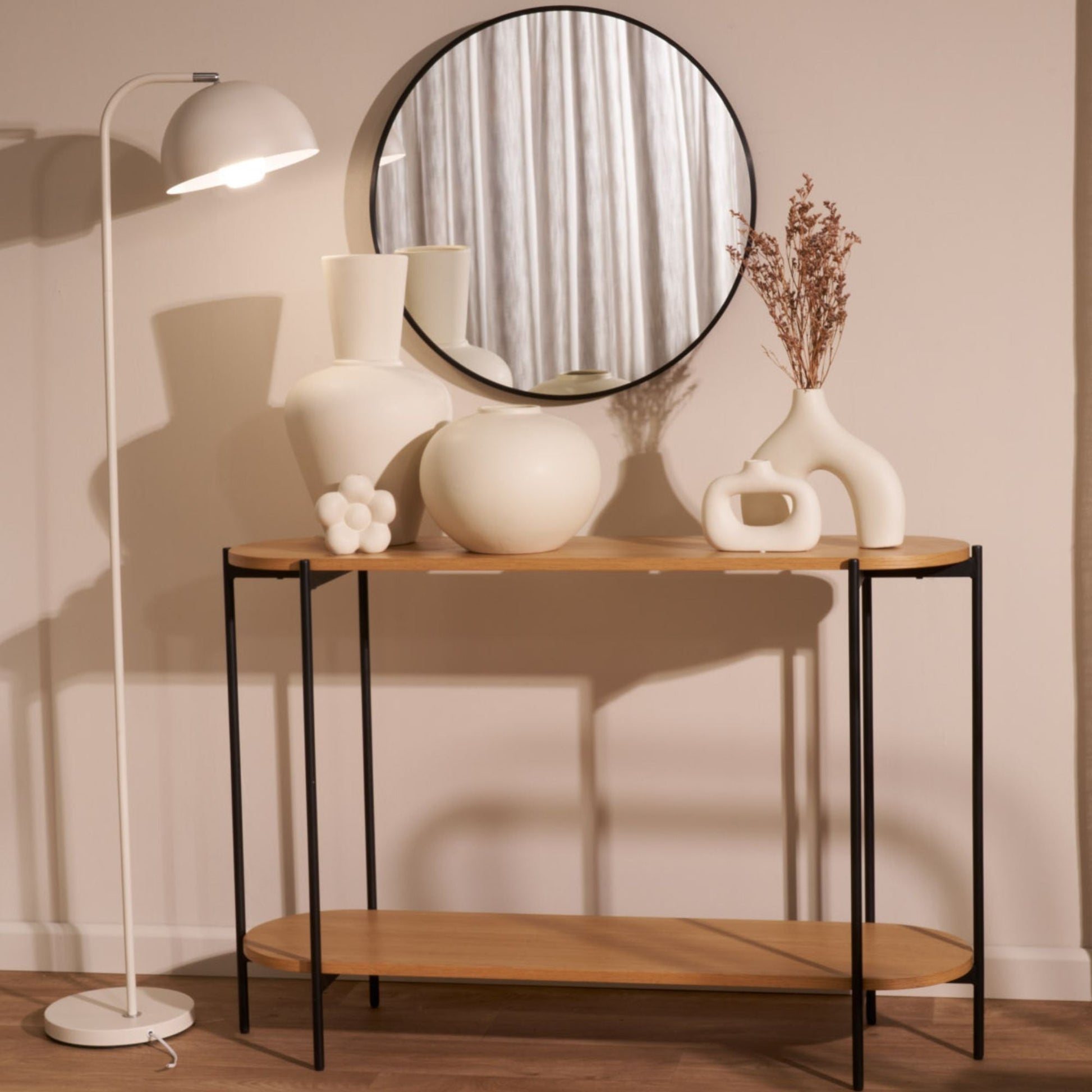Avec ses deux étagères et son élégant cadre noir, la console Rhys est idéale pour une entrée et permet de poser ses clés en rentrant. Associez-la à votre décoration intérieure pour un accueil chaleureux.