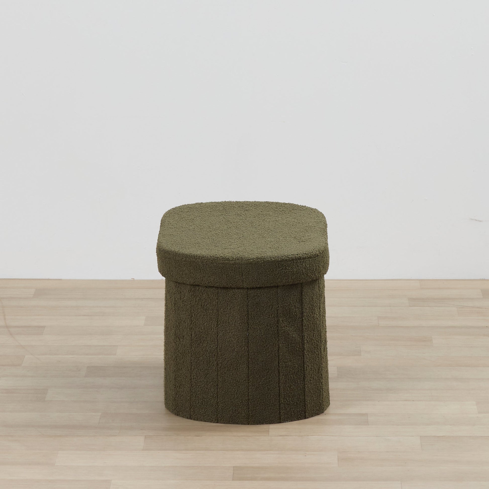 Organisez-vous avec style grâce au pouf Toby, une solution de rangement spacieuse revêtue d'un élégant tissu bouclé vert olive.